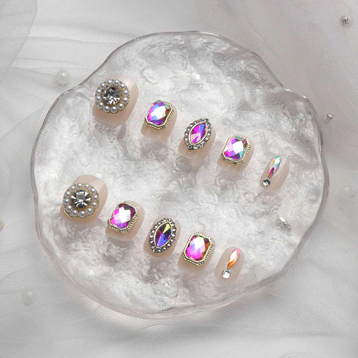 Transform your look with VIBEFICANT GLAZE squoval extra short nude press-on nails. Featuring bold rhinestone and pearl embellishments, these durable, salon-quality nails offer effortless style and elegance.