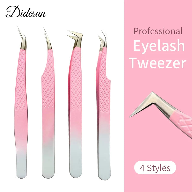 Didesun Pink Lash Tweezers Stainless Steel Eyelash Extensions Tweezers Fiber Tip High Precision Tweezers Makeup Tools